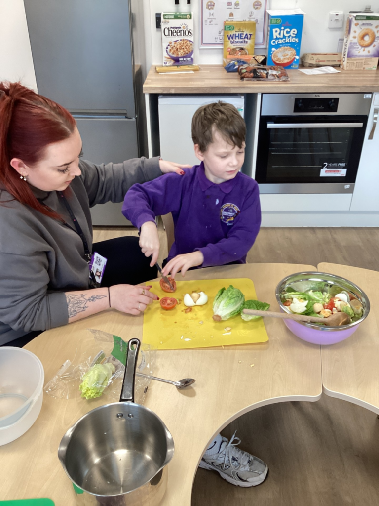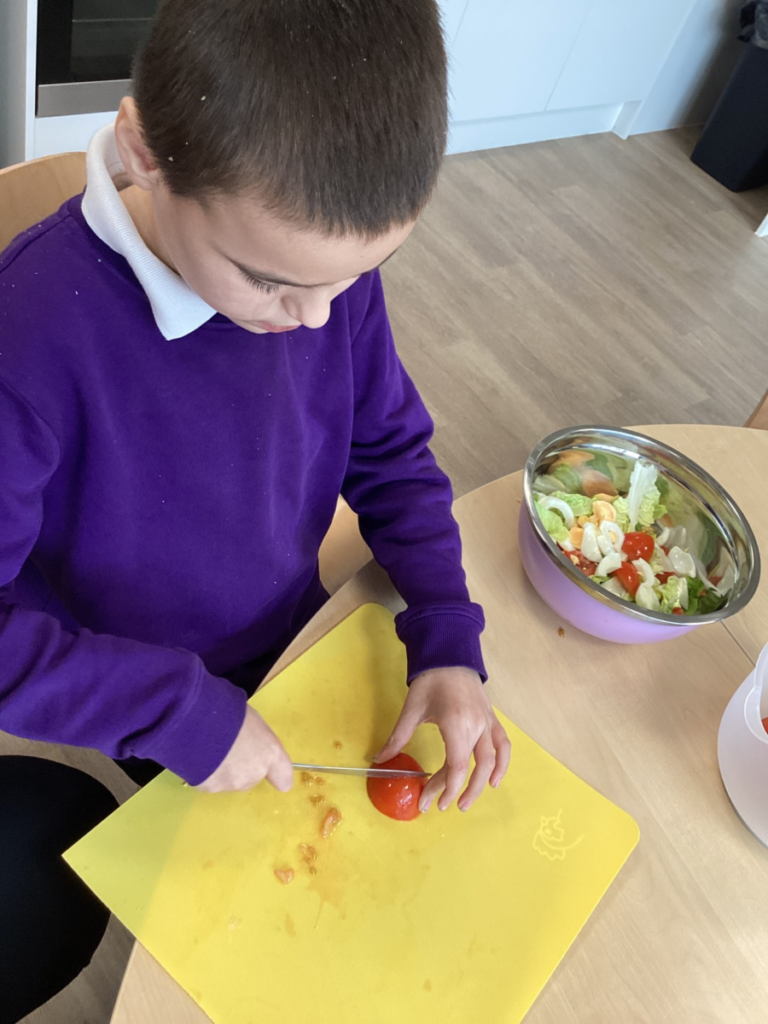 In Michelle’s class we have been learning about healthy food choices. We made an egg salad which involved exploring and tasting various salad items, peeling eggs and using a knife to chop and slice.