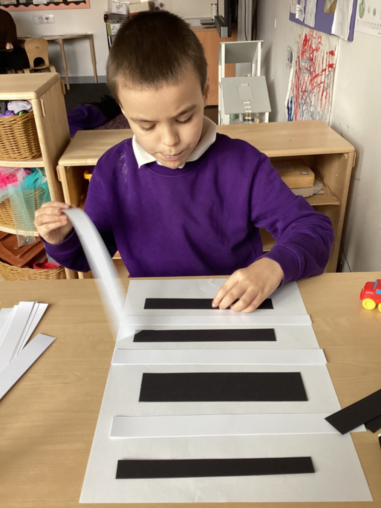 Pour class text has been Burglar Bill, we recreated the black and white stripes from his jumper using lengths of card and a glue stick.